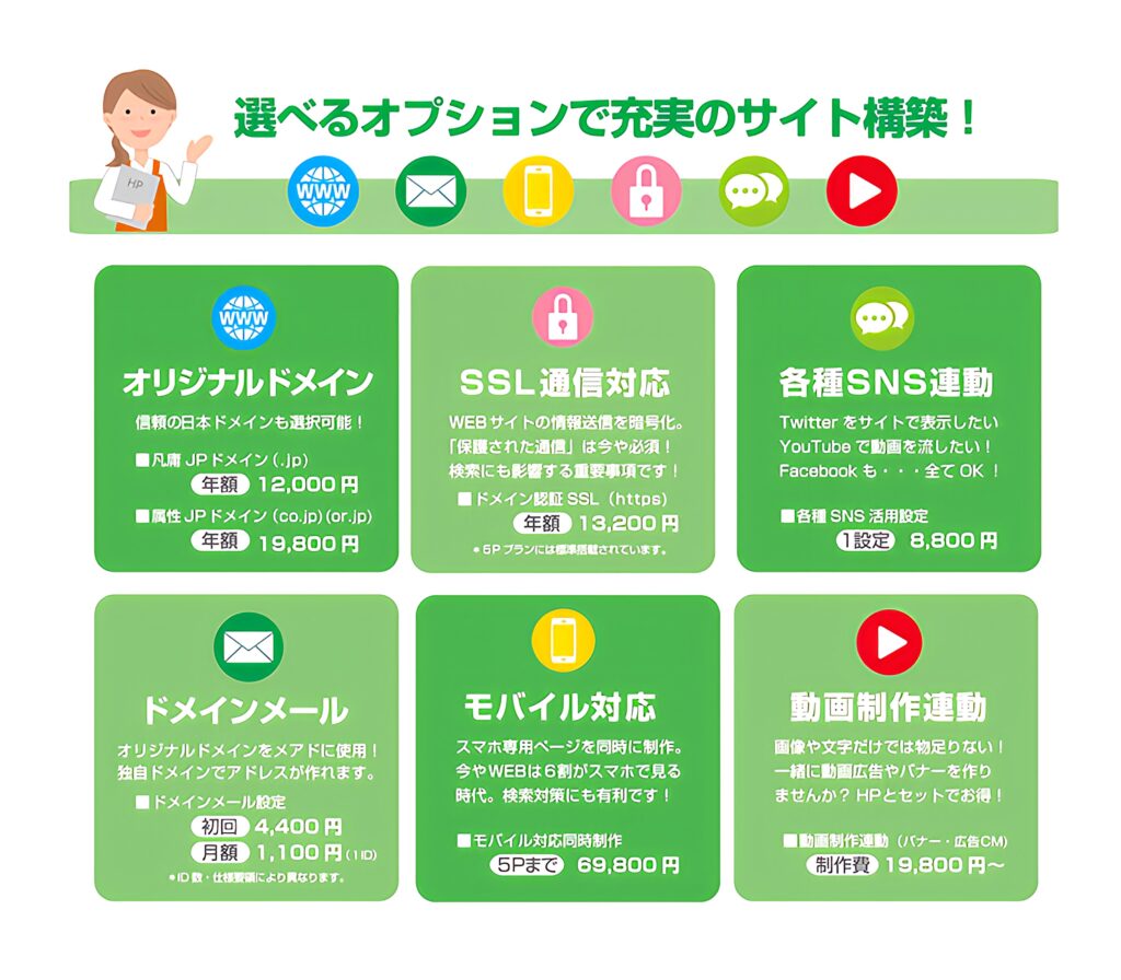 | シンプルプラン | 5ページ+画像加工25点+問合わせフォーム、SEO対策、GoogleMap他 ※SEO対策に関しましては効果を保証するものではありません。 ※1,2,4 | 80,000円~ |
